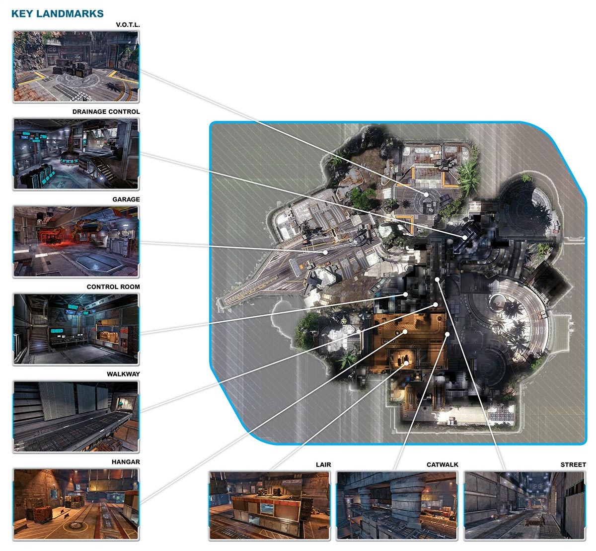 • 閉所の多い中央部と広いブロックに区切られた外周部に分かれている。消耗戦の序盤ではSTREETを挟んでの撃ちあいとなるのでDMRなどの遠距離向けの武器が活躍する。ショットガンなどの近距離武器を選択した場合は小部屋を移動するようにしよう。外周部をタイタンで移動する場合は必然的に狭い通路を通るためヴォルテックスシールドやパーティクルウォールがあると防御しやすい。 -- 2014-03-30 (日) 01:45:47